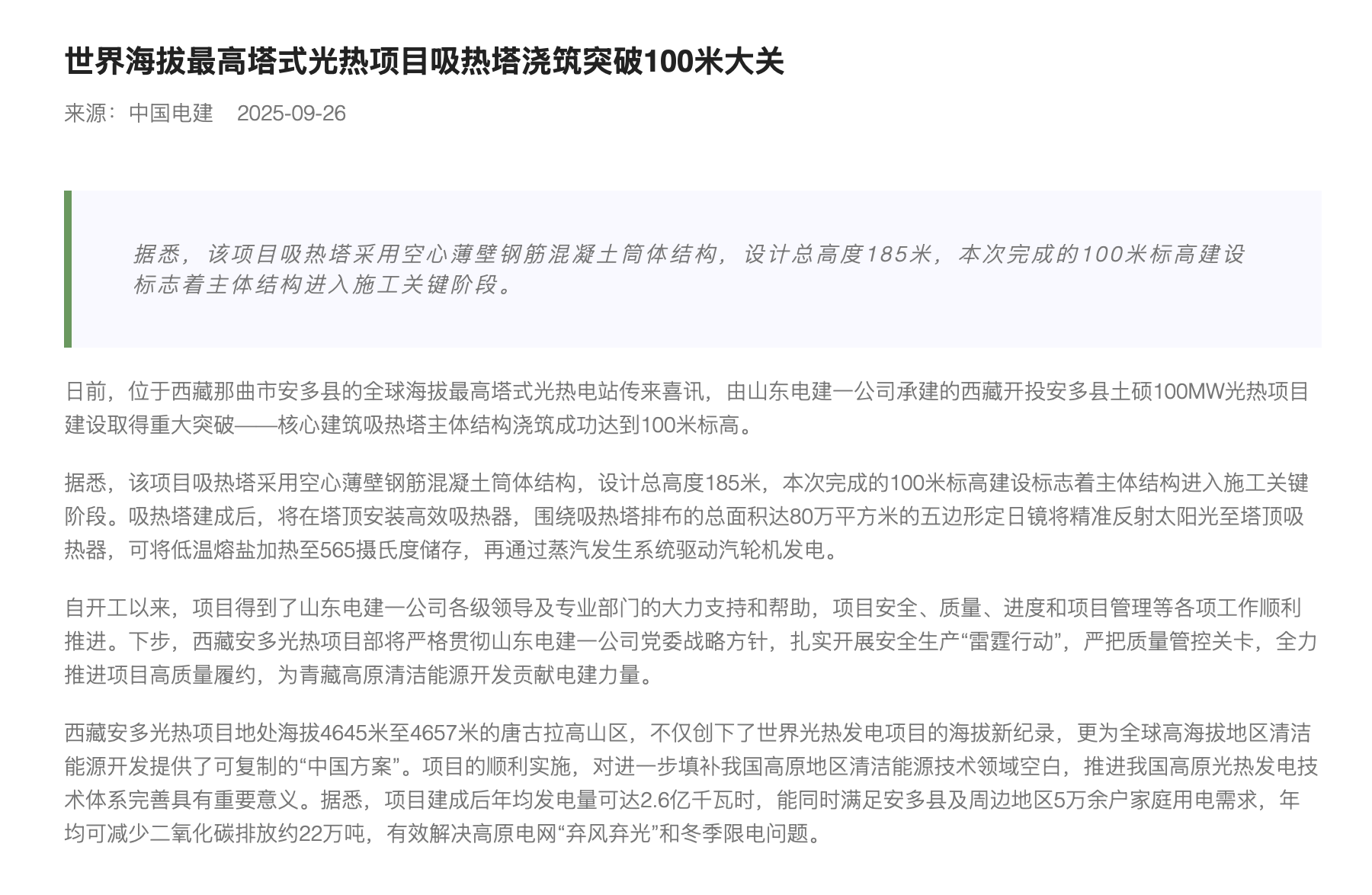世界海拔最高塔式光热项目吸热塔浇筑突破100米大关