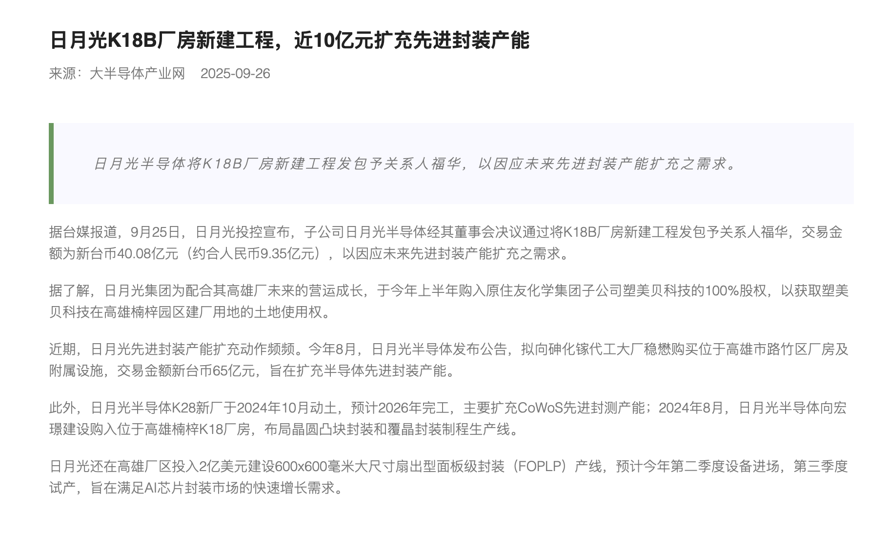 日月光K18B厂房新建工程,近10亿元扩充先进封装产能