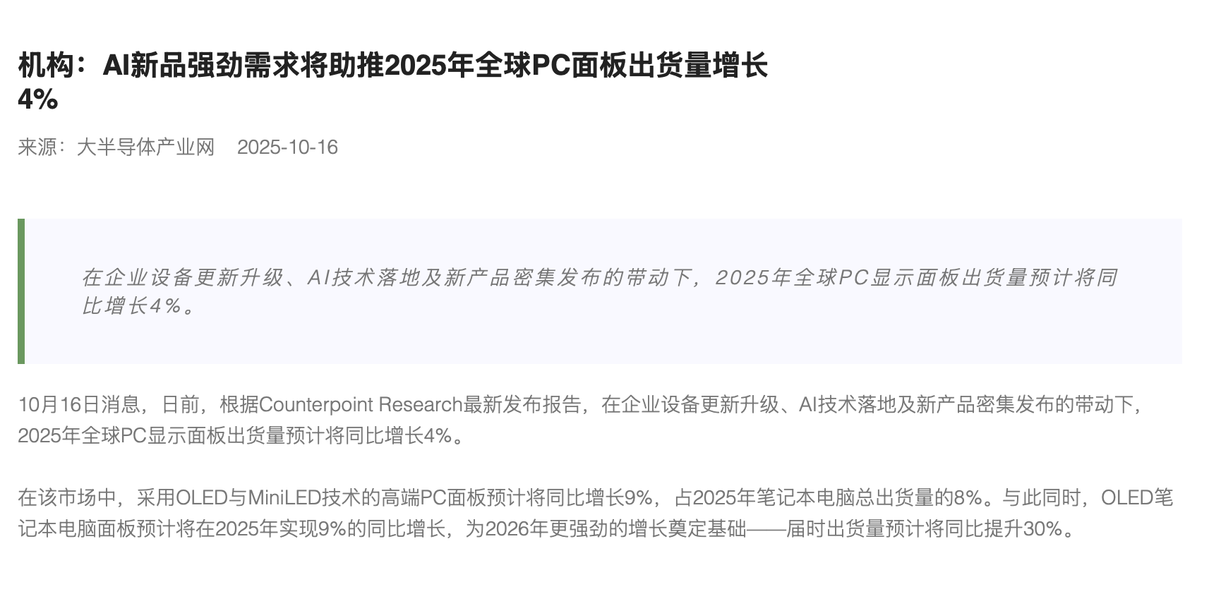机构:AI新品强劲需求将助推2025年全球PC面板出货量增长4%