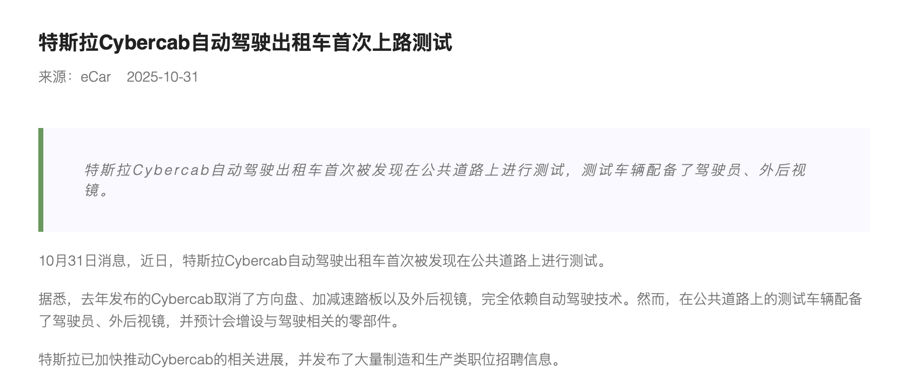 特斯拉Cybercab自动驾驶出租车首次上路测试