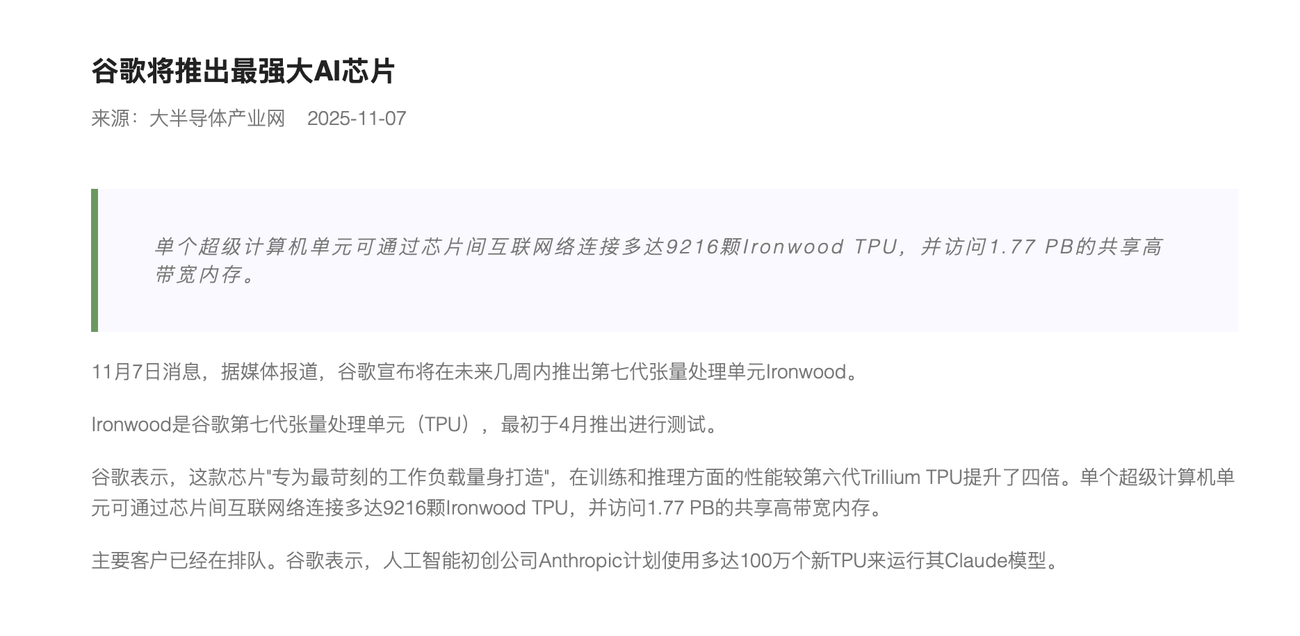 谷歌将推出最强大AI芯片