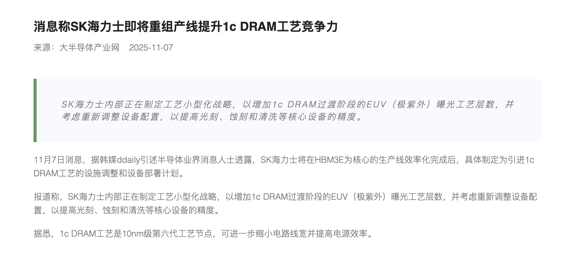 消息称SK海力士即将重组产线提升1cDRAM工艺竞争力