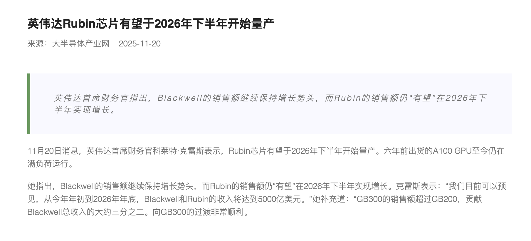 英伟达Rubin芯片有望于2026年下半年开始量产英伟达Rubin芯片有望于2026年下半年开始量产