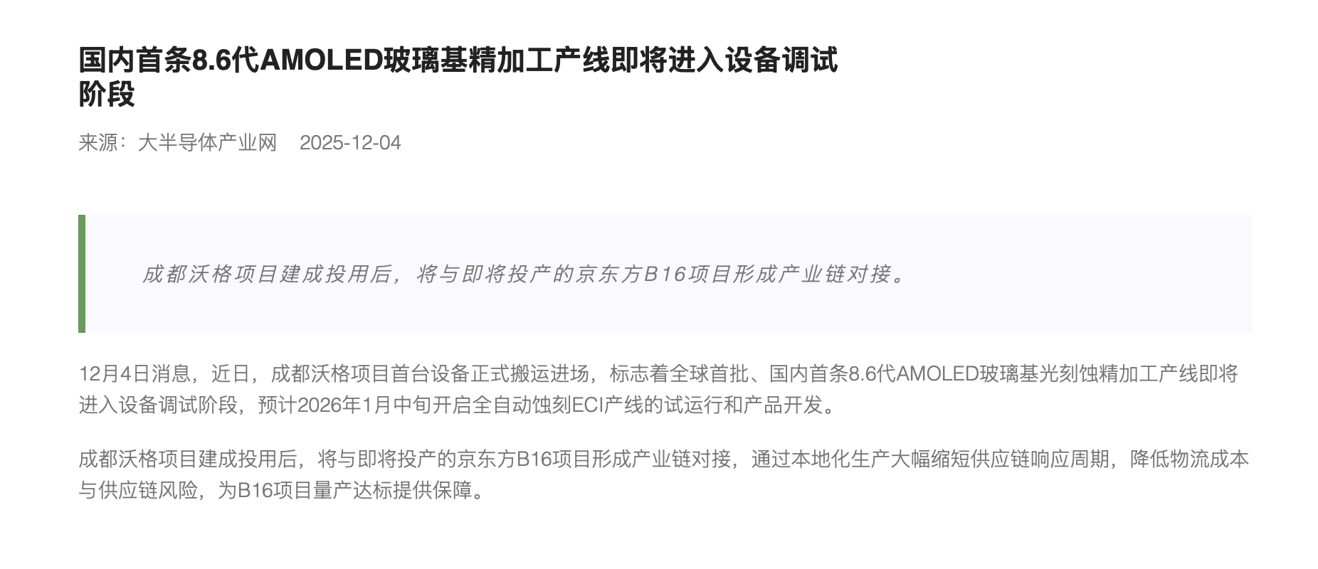国内首条8.6代AMOLED玻璃基精加工产线即将进入设备调试阶段