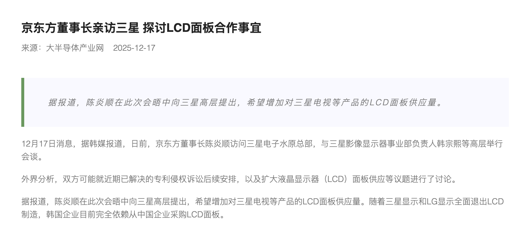 京东方董事长亲访三星探讨LCD面板合作事宜