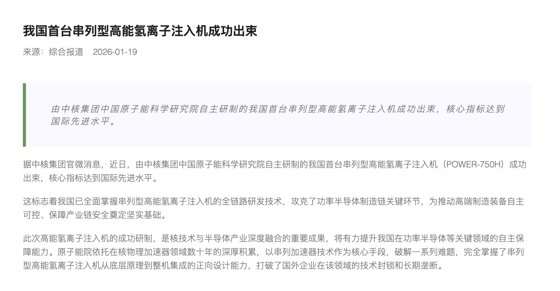 我国首台串列型高能氢离子注入机成功出束