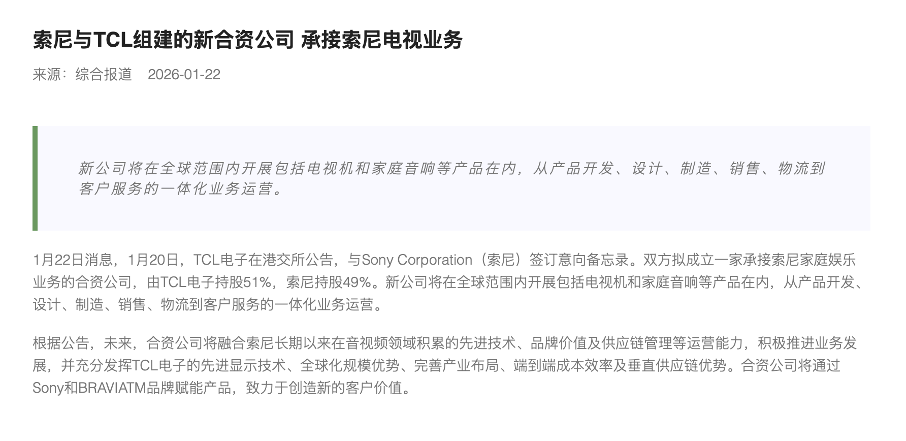 索尼与TCL组建的新合资公司承接索尼电视业务
