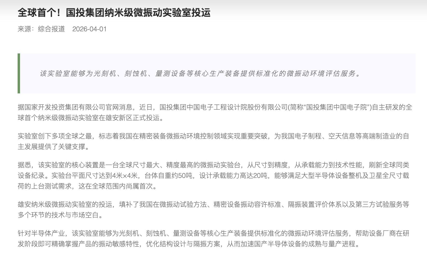 全球首个!国投集团纳米级微振动实验室投运