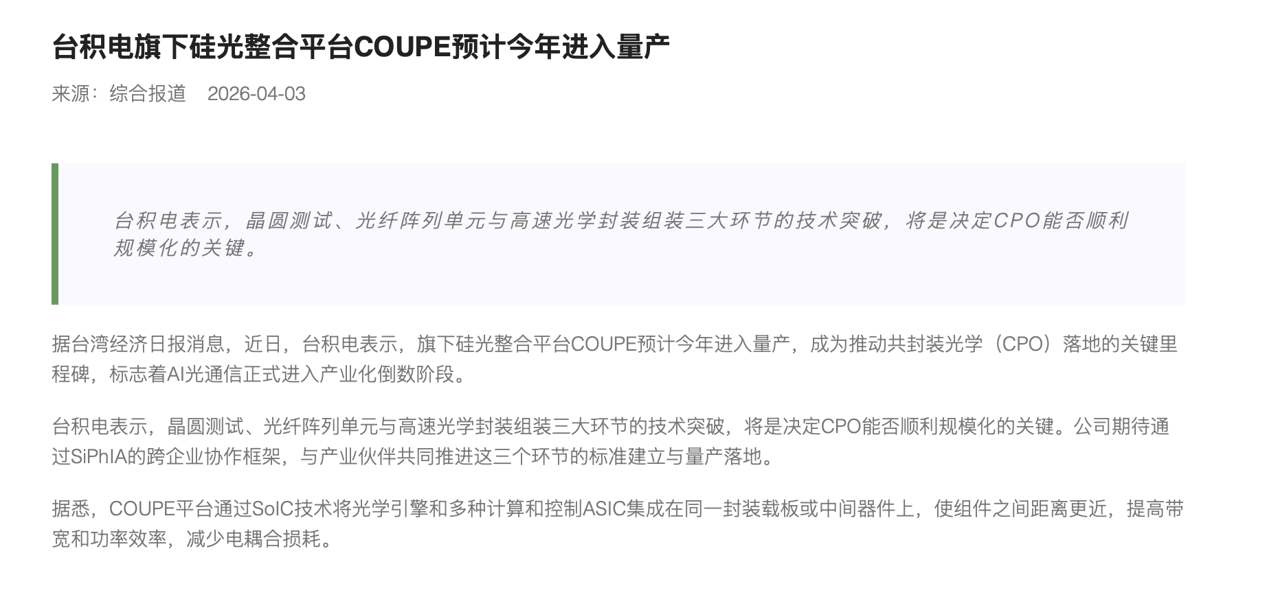 台积电旗下硅光整合平台COUPE预计今年进入量产