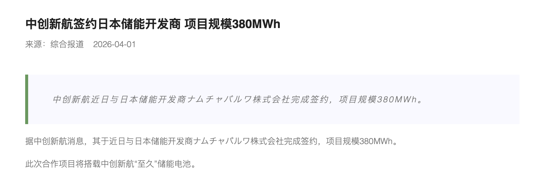 中创新航签约日本储能开发商项目规模380MWh