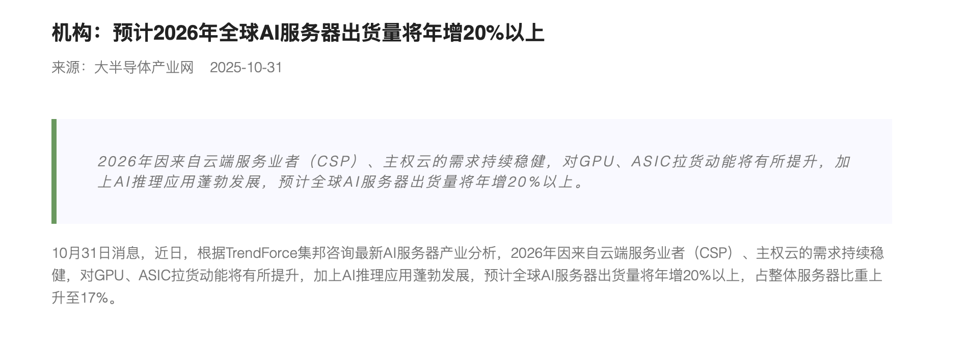 机构:预计2026年全球A1服务器出货量将年增20%以上