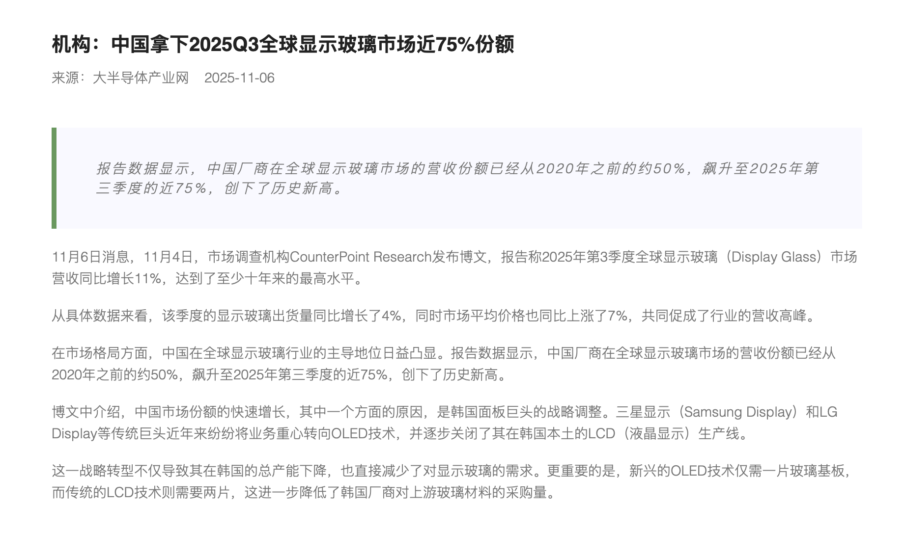 机构:中国拿下2025Q3全球显示玻璃市场近75%份额