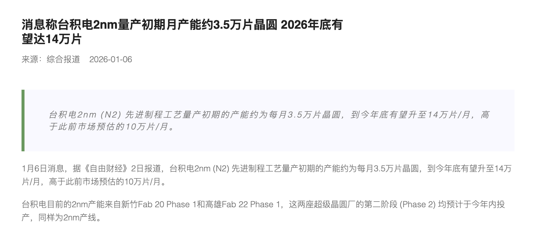 消息称台积电2nm量产初期月产能约3.5万片晶圆2026年底有望达14万片