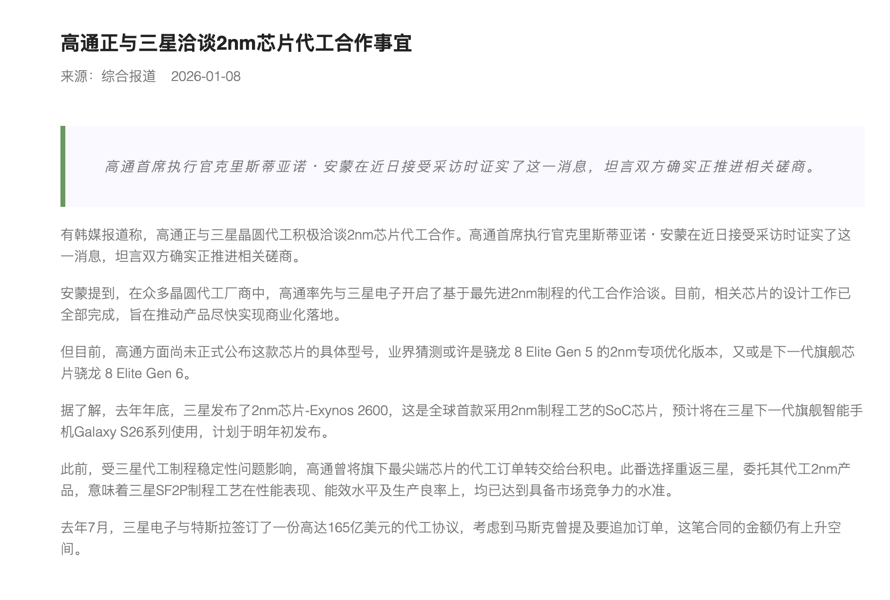 高通正与三星洽谈2nm芯片代工合作事宜