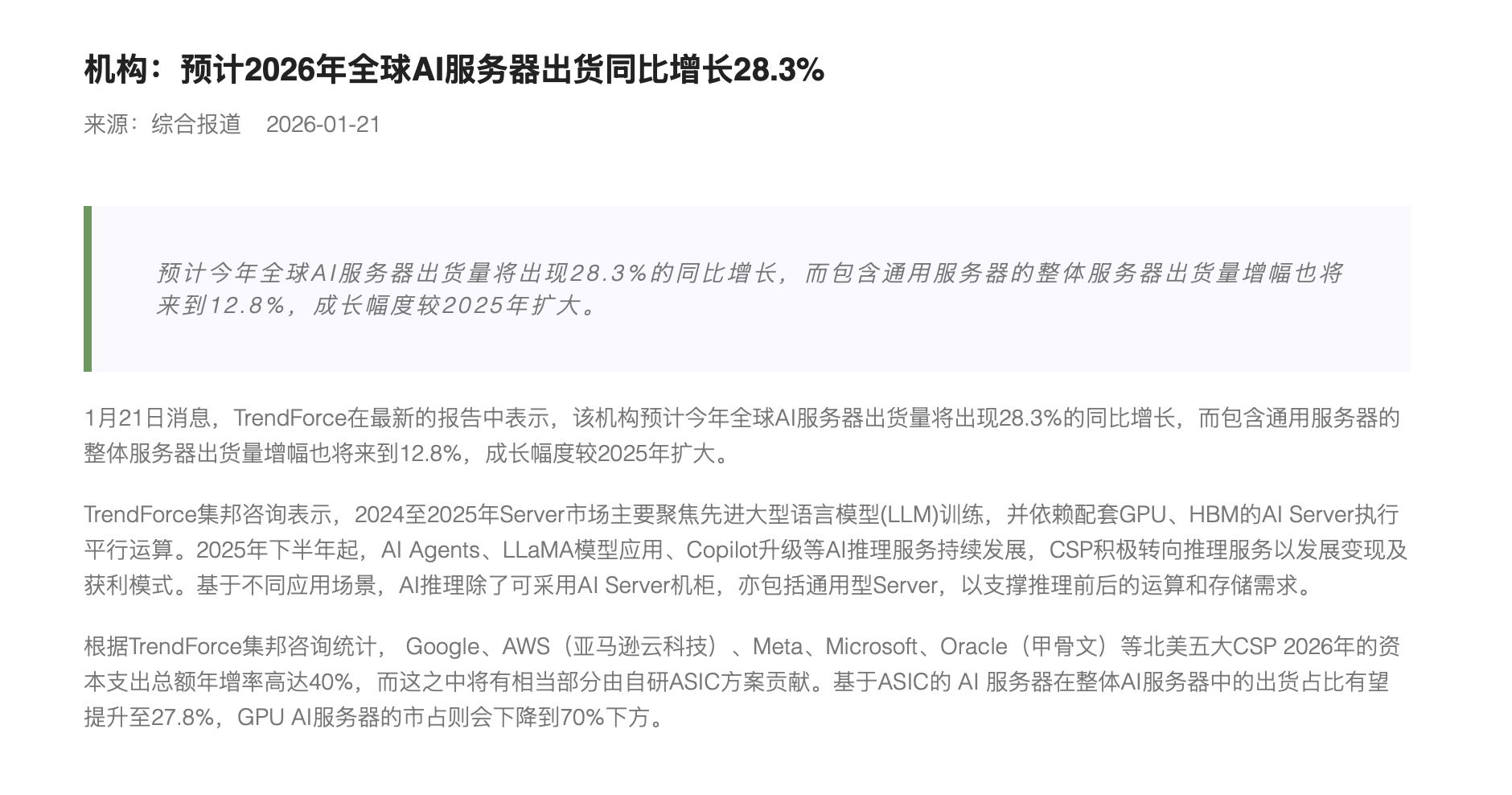机构:预计2026年全球AI服务器出货同比增长28.3%