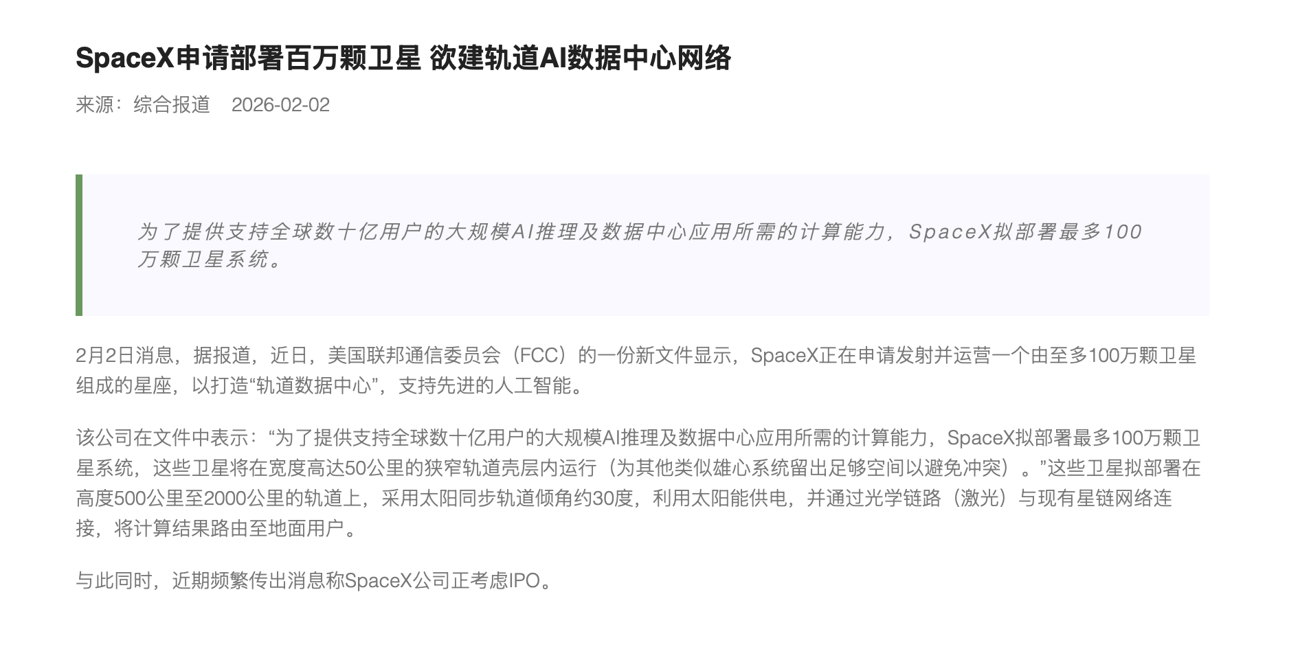 SpaceX申请部署百万颗卫星 欲建轨道Al数据中心网络