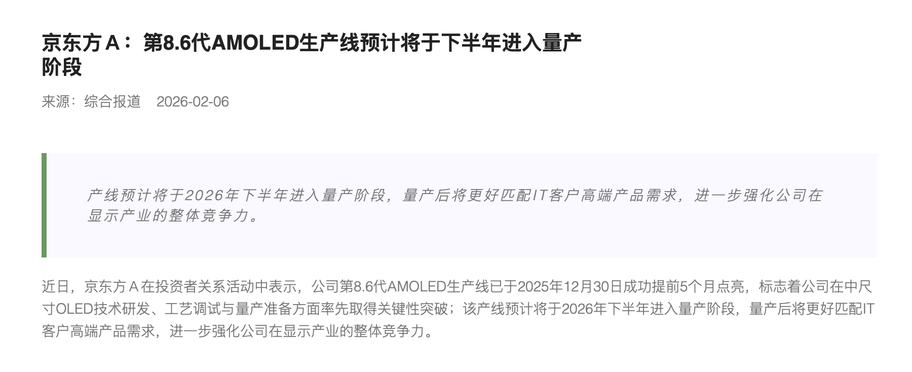 京东方A:第8.6代AMOLED生产线预计将于下半年进入量产阶段