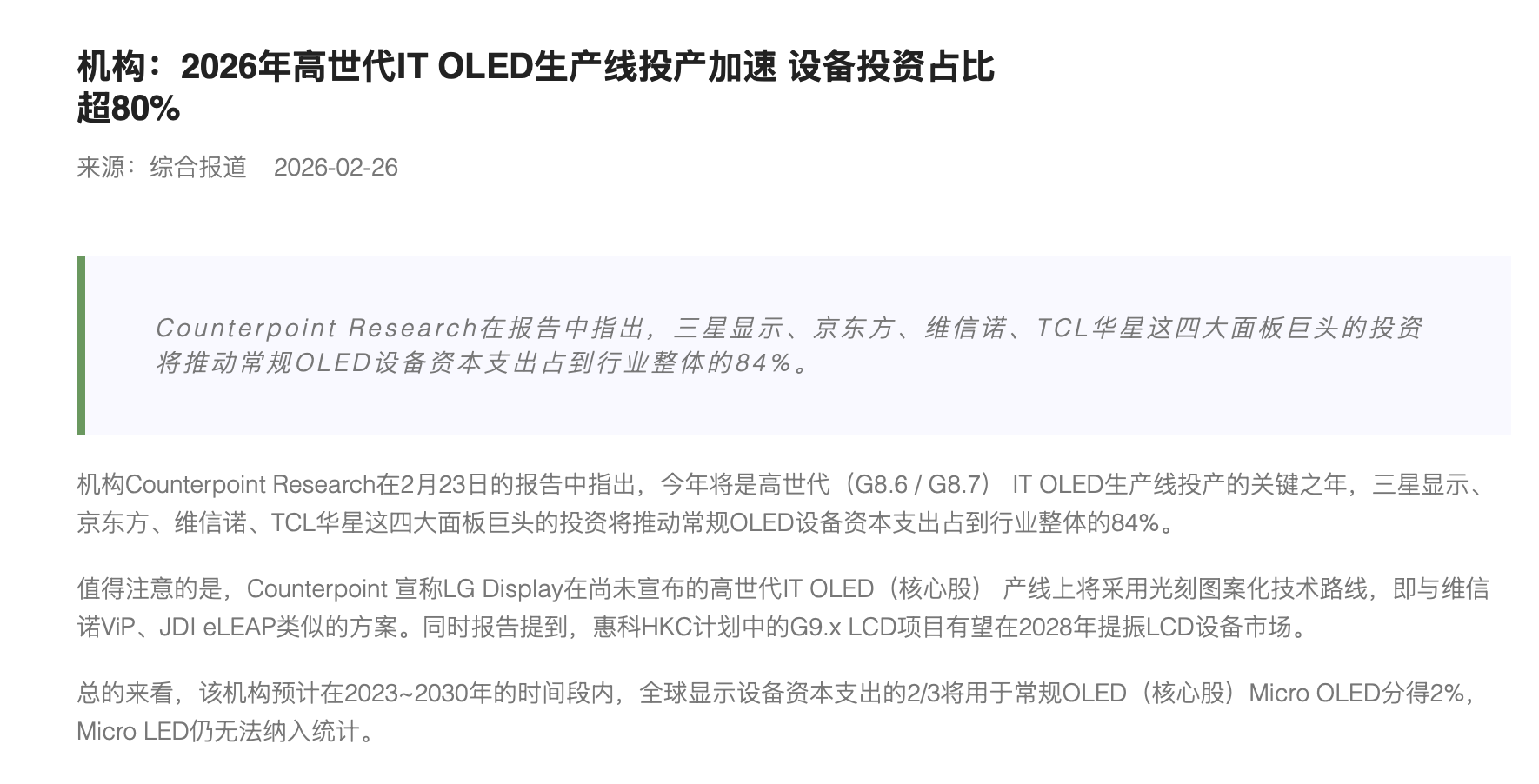 机构:2026年高世代ITOLED生产线投产加速设备投资占比超80%