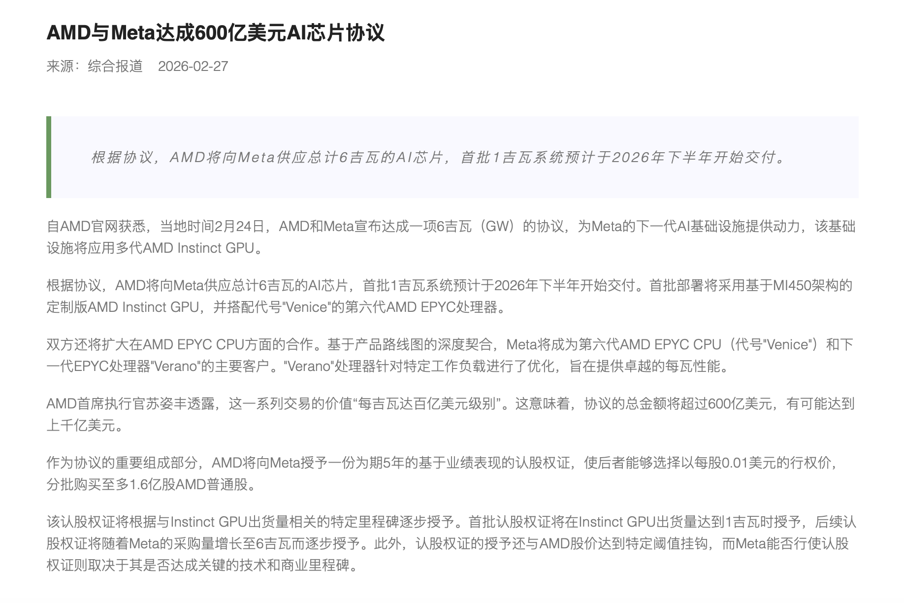 AMD与Meta达成600亿美元AI芯片协议