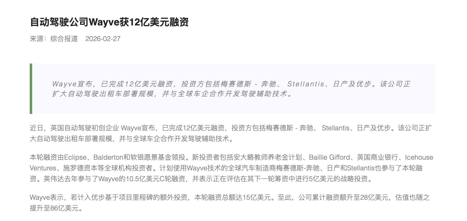 自动驾驶公司Wayve获12亿美元融资