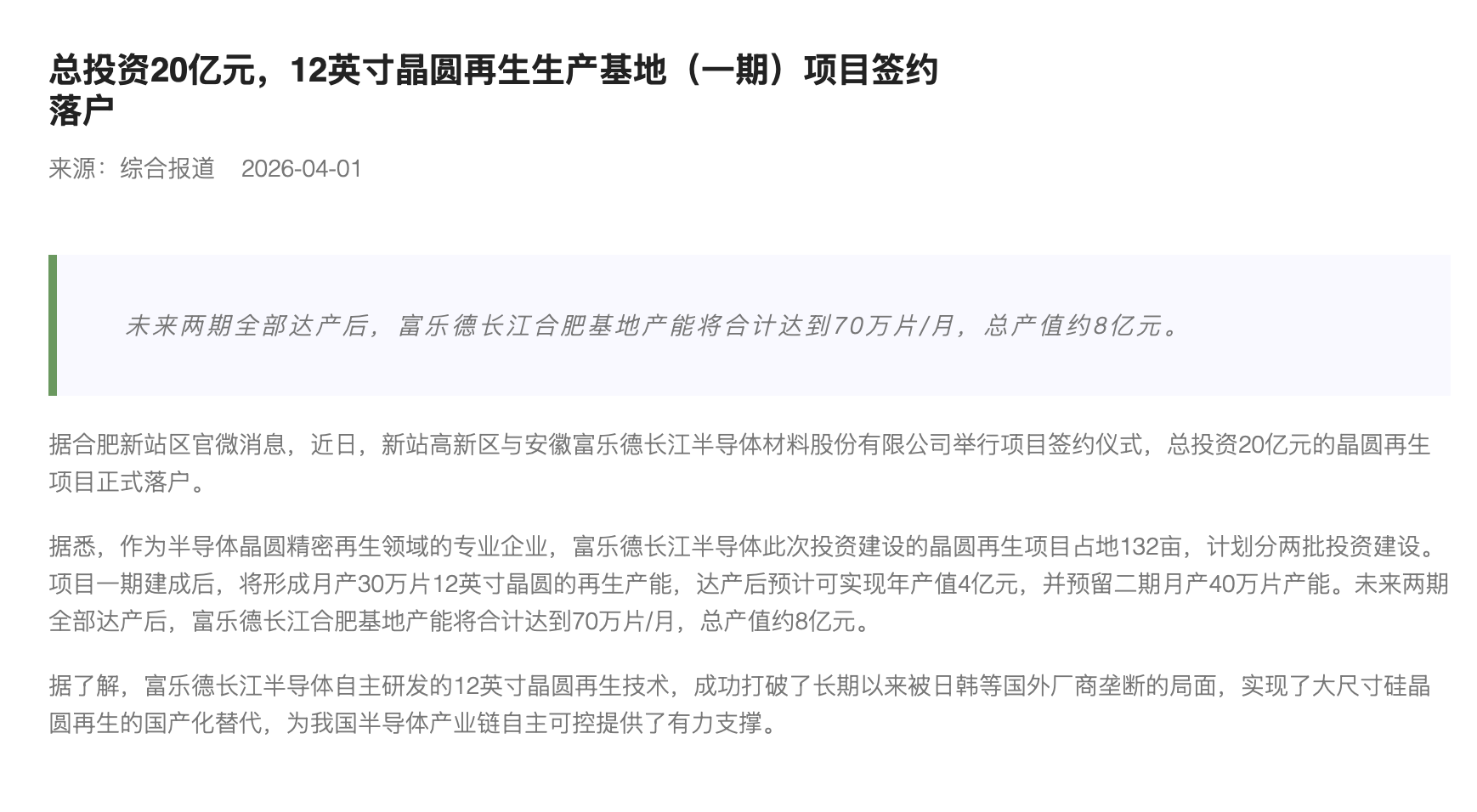 总投资20亿元,12英寸晶圆再生生产基地(一期)项目签约落户