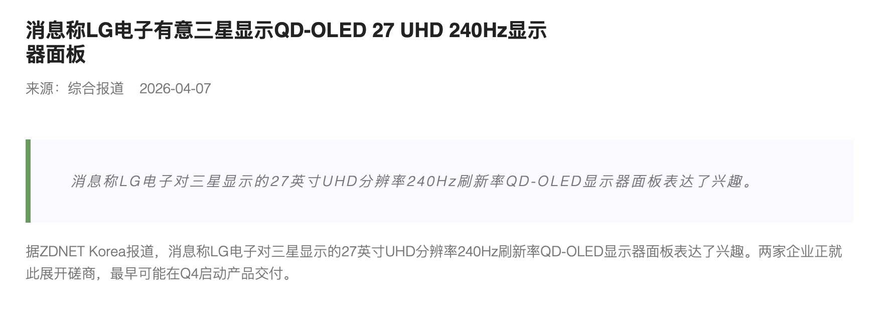 消息称LG电子有意三星显示QD-OLED 27UHD 24OHz显示器面板