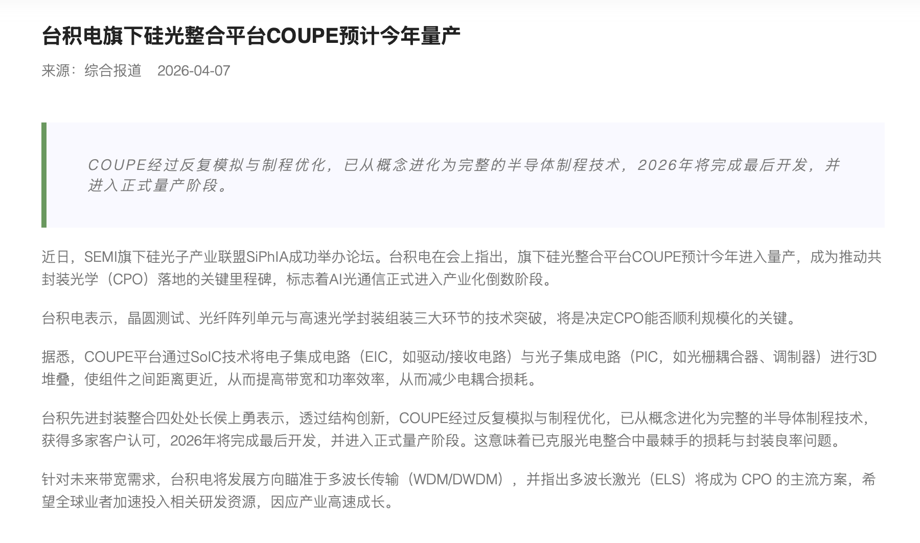 台积电旗下硅光整合平台COUPE预计今年进入量产